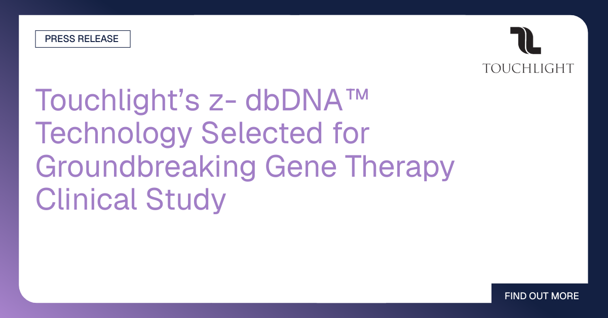 Touchlight announced today that its proprietary z- dbDNA™ technology is to be utilised as a critical starting material in the manufacture of a cutting-edge gene therapy for a US-based clinical…